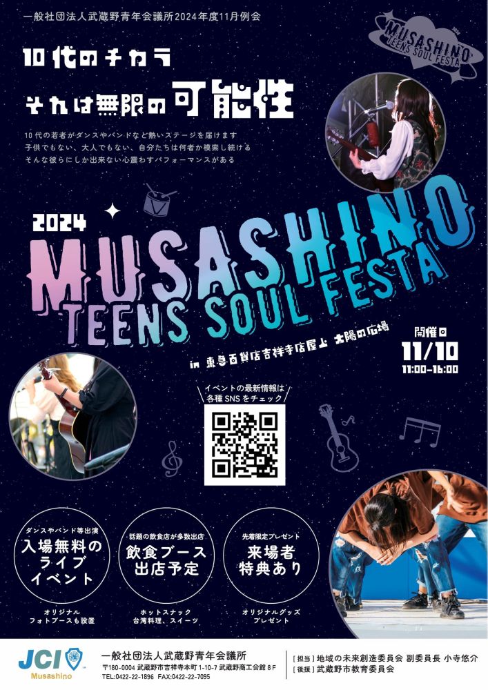 MUSASHINO TEENS SOUL FESTA 2024 開催日 2024年11月10日(日) 時間 11:00〜16:00 料金など 無料 会場 東急百貨店吉祥寺店屋上 太陽の広場〒180-8519 武蔵野市吉祥寺本町2-3-1 主催 [主催](一社)武蔵野青年会議所 [後援]武蔵野市教育委員会 X @mtsf_2024 Instagram @mtsf_2024