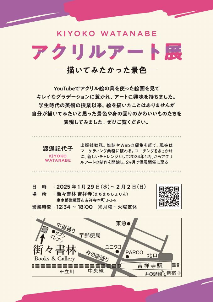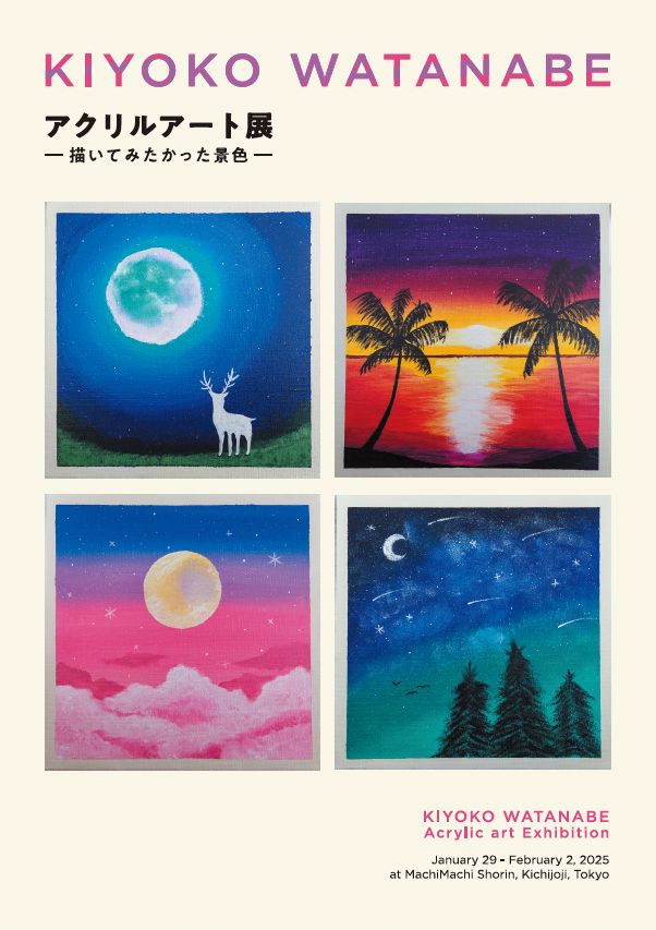 KIYOKO WATANABE アクリルアート展 開催日 2025年1月29日(水)~2月2日(日) 時間 12:34~18:00 会場 街々書林 Books & Gallery〒180-0004 東京都武蔵野市吉祥寺本町3-3−9 Web https://machi2.hp.peraichi.com/tabi/ X @machi2syorin Facebook www.facebook.com/machi2syorin Instagram @machi2syorin