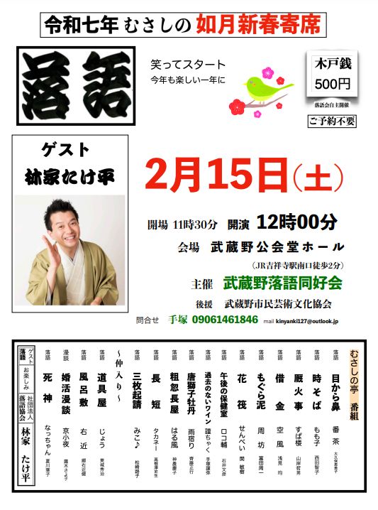 目から鼻 番茶 時そば もも子 厩火事 すぱ楼 借金 空風 もぐら泥 周坊 花筏 せんべい 午後の保健室 ロコ輔 過去のないワイン 謹ちゃく 唐獅子牡丹 雨宿り 粗忽長屋 はる風 長短 タカネー 三枚起請 みこ♪ 〜 仲入り 〜 道具屋 じょう 風呂敷 右近 婚活漫談 京小夜 死神 なっちゃん