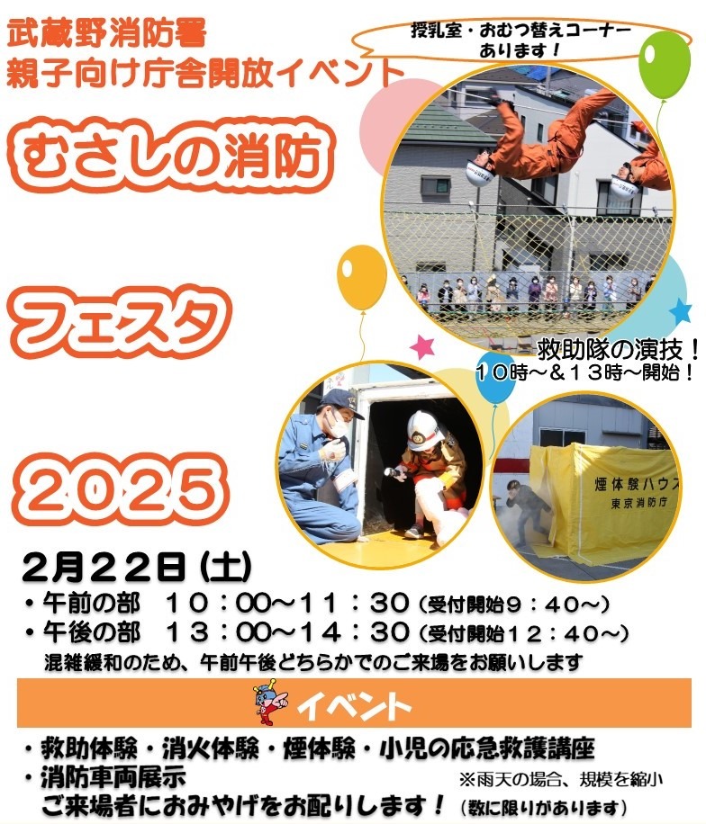 武蔵野消防署で親子向けの庁舎開放イベントが開催されます。