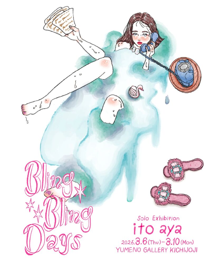 ito aya 個展「Bling Bling Days」 開催日 2025年3月6日(木)〜10日(月) 時間 12:00〜20:00(最終日16:00まで) 会場 ユメノギャラリー吉祥寺〒180-0002 東京都武蔵野市吉祥寺東町1-5-13 はぴすと押山2F Web https://www.yumenogallerykichijoji.com/schedule/ Instagram @DFhvC-JS61m