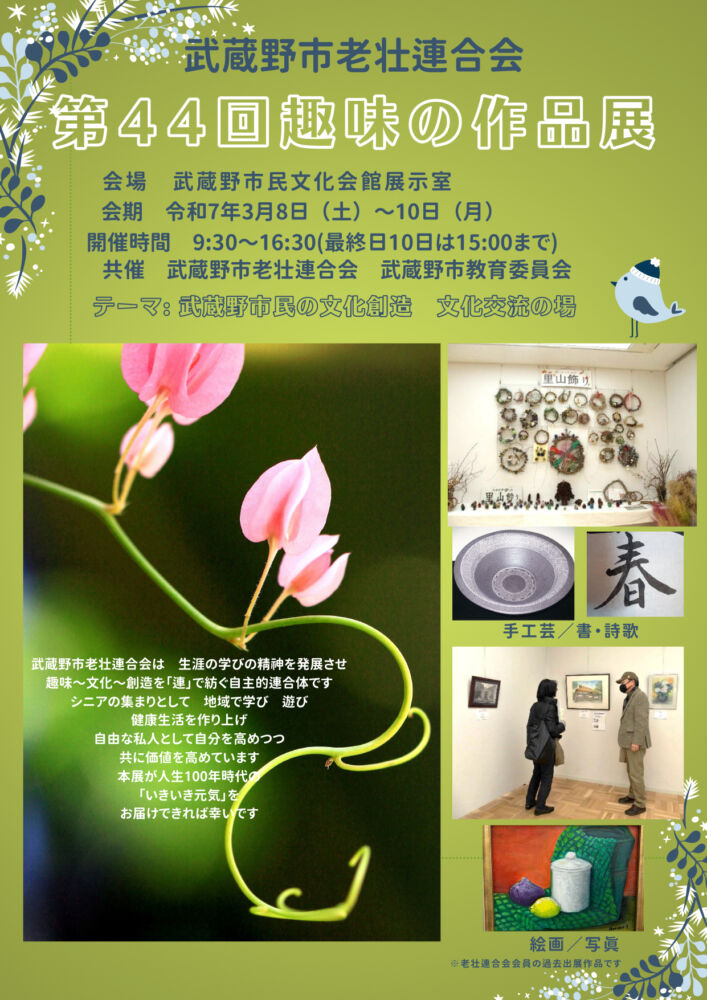 武蔵野市老壮連合会第44回「趣味の作品展」 開催日 2025年3月8日(土)、9日(日)、10日(月) 時間 9:30〜16:30(最終日15:00まで) 料金など 無料 対象:どなたでも 会場:展示室 お問い合わせ 武蔵野プレイス 0422-30-1901 会場 武蔵野市民文化会館〒180-0006 東京都武蔵野市中町3丁目9−11 Web https://www.musashino.or.jp/place/1001585/rousour733.html