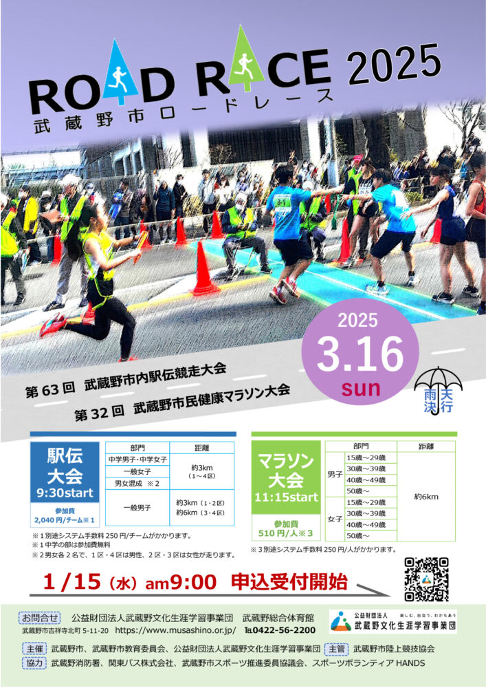 武蔵野市ロードレース2025 「武蔵野市ロードレース」として、「第63回武蔵野市内駅伝競走大会」と「第32回武蔵野市民健康マラソン大会」が開催されます。 開催日 2025年3月16日(日) ※雨天決行 時間 武蔵野市内駅伝競走大会9:30〜 武蔵野市民健康マラソン大会11:15〜 料金など 会場:武蔵野市役所周辺 Web https://www.city.musashino.lg.jp/heiwa_bunka_sports/sports_taikengakushu/event_sports/1040999.html