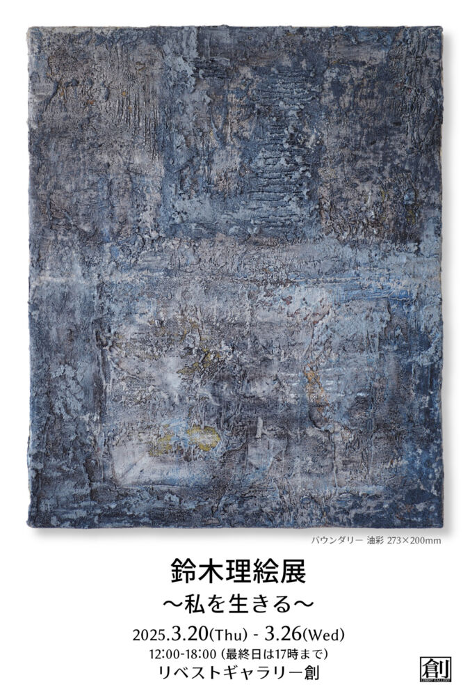 鈴木理絵展 ~私を生きる~ 開催日 2025年3月20日(木)〜26日(水) 時間 12:00~18:00(最終日17:00まで) 会場 リベストギャラリー創〒180-0002 武蔵野市吉祥寺東町1-1-19 Web https://libestgallery.jp/2025-03-20/