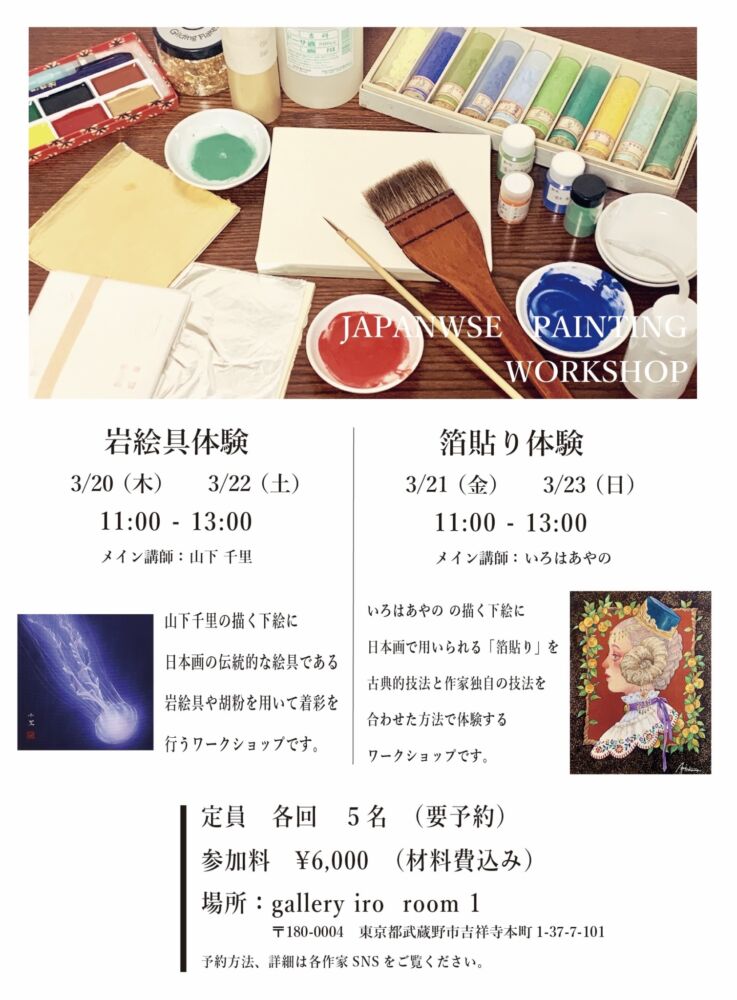 山下千里×いろはあやの workshop and exhibition 『Departure』 開催日 2025年3月20(木・祝)〜23日(日) 時間 ワークショップ11:00〜13:00(受講者のみ) 展示13:30〜18:00(入場自由) 会場 GALLERY IRO〒180-0004 東京都武蔵野市吉祥寺本町1-37-7-101 吉祥寺駅より西荻窪方面へ歩いて7分程度、五日市街道沿い。 Web https://1-6.jp/departure