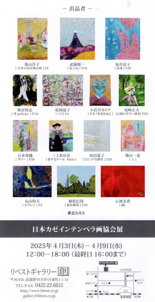日本カゼインテンペラ画協会展 開催日 2025年4月3日(木)〜9日(水) 時間 12:00~18:00(最終日16:00まで) 会場 リベストギャラリー創〒180-0002 武蔵野市吉祥寺東町1-1-19 Web https://libestgallery.jp/2025-04-03/