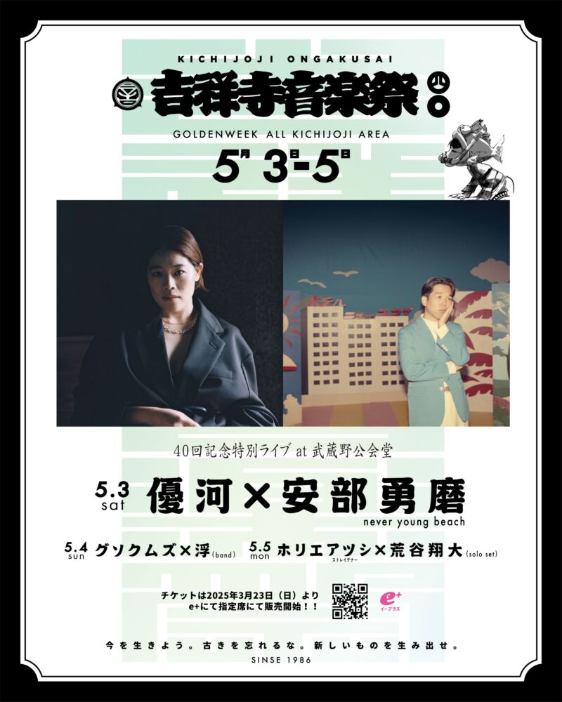 料金:入場無料(武蔵野公会堂・吉祥寺PARCOライブは有料) 会場:吉祥寺全域 ※特設ステージ9ヶ所 ライブ:吉祥寺駅北口駅前広場、武蔵野公会堂、井の頭恩賜公園、公園通り✕東急百貨店吉祥寺店、SEIYU✕サンロード、平和通り、PENNY LANE、コピス吉祥寺、吉祥寺PARCO マーケット:公園通り✕東急百貨店吉祥寺店、吉祥寺マルイ、井の頭恩賜公園