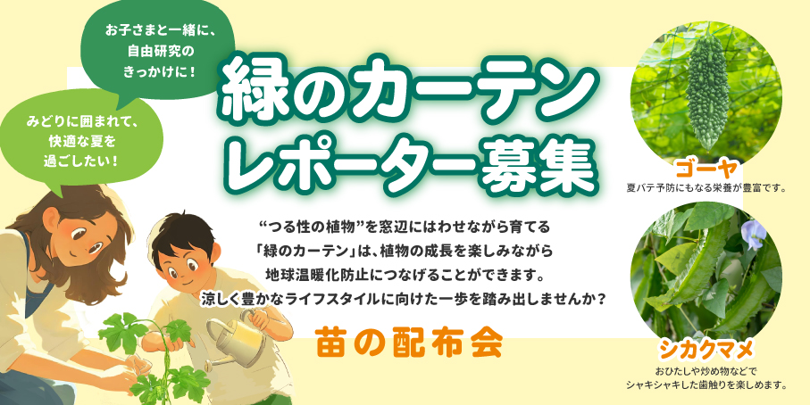 「緑のカーテンレポーター」募集 苗の配布会 開催日 2025年5月18日(日)~25日(日) ※20日(火)休館日 時間 9:30〜17:00 料金など 【苗の配布会】 無料 対象:武蔵野市内在住・在勤・在学の方 定員:150世帯(申込制・先着) 配布する苗:1世帯につき、ゴーヤ2苗シカクマメ1苗まで 会場 むさしのエコreゾート〒180-0012 武蔵野市緑町3丁目1番5号 Web https://musashino-ecoresort.com/eventinfo/eventnews/greencurtain2025/