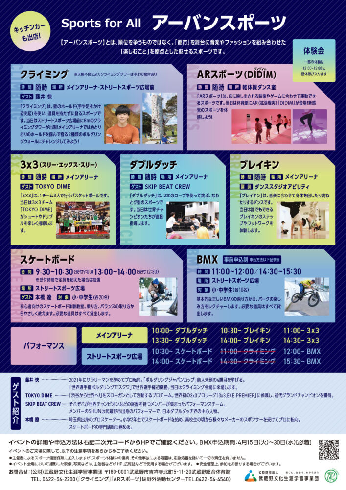 無料 ※BMXは事前申込み 対象:どなたでも ※スケートボード・BMXの対象は小中学生 会場:武蔵野総合体育館メインアリーナ/軽体操ダンス室/ストリートスポーツ広場