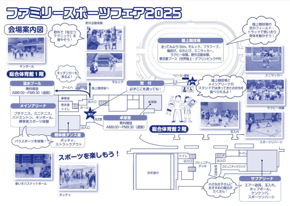 <種目> 走ってみよう!50メートル、モルック、フラフープ、輪投げ、なわとび、ミニサッカー、ラグビー体験、野外活動体験、プチテニス、ミニテニス、バドミントン、キンボール、車いすバスケットボール、陸上競技用車いす体験、卓上カーリング、エアー遊具、玉入れ、ホップボール、ケンケンパ、スポーツリバーシ、ボッチャ、ストラックアウト、東京都ブース(世界陸上・デフリンピックPR) <その他> 東京都ブース(世界陸上・デフリンピックPR)が出展。 キッチンカーが出店。