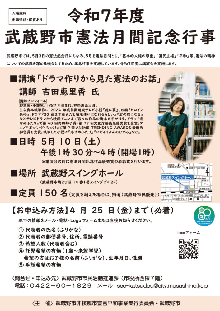 1.吉田 恵里香氏による講演「ドラマ作りから見た憲法のお話」 2.憲法月間記念作品(書道、絵手紙・イラスト)の優秀賞受賞者の表彰 ((注意)講演の前に実施) 3.憲法月間記念作品入賞者の作品の展示
