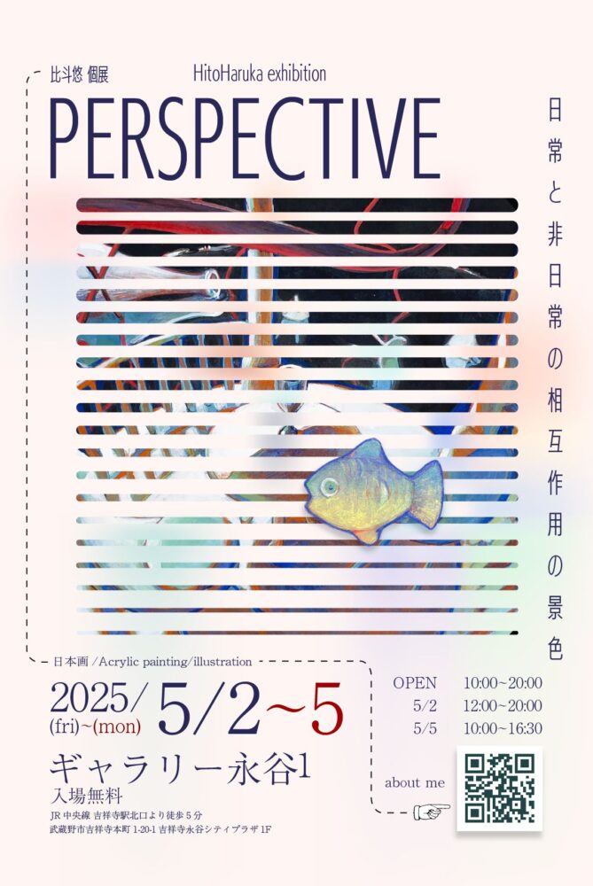 比斗悠 個展 PERSPECTIVE 開催日 2025年5月2日(金)~ 5日(月・祝) 時間 10:00~20:00(初日12:00から、最終日16:30まで) 会場 ギャラリー永谷 Web http://www.ntgp.co.jp/rentalspace/gallery.html X @kioku_koshitsu