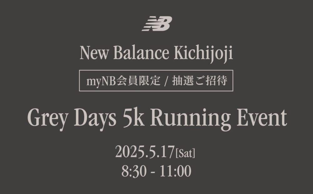 ニューバランス Grey Days 5k Running Event 開催日 2025年5月17日(土) 時間 8:30〜11:00 料金など 無料 対象:myNB会員 定員:30名 お問い合わせ 0422-27-1938 会場 ニューバランス吉祥寺〒180-0004 東京都武蔵野市吉祥寺本町2丁目8−13 Chloris Kichijoji吉祥寺駅から徒歩7分 大正通り沿い Web https://company.newbalance.jp/store/official-store/kichijoji X @NewBalance Facebook www.facebook.com/NewBalanceJapan Instagram @newbalance