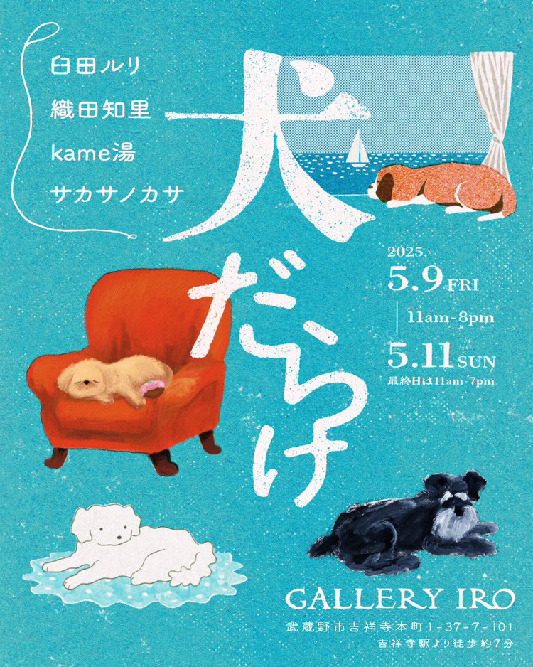 犬だらけ 開催日 2025年5月9日(金)〜11日(日) 時間 11:00〜20:00(最終日19:00まで) 会場 GALLERY IRO〒180-0004 東京都武蔵野市吉祥寺本町1-37-7-101 吉祥寺駅より西荻窪方面へ歩いて7分程度、五日市街道沿い。 Web https://1-6.jp/20250509