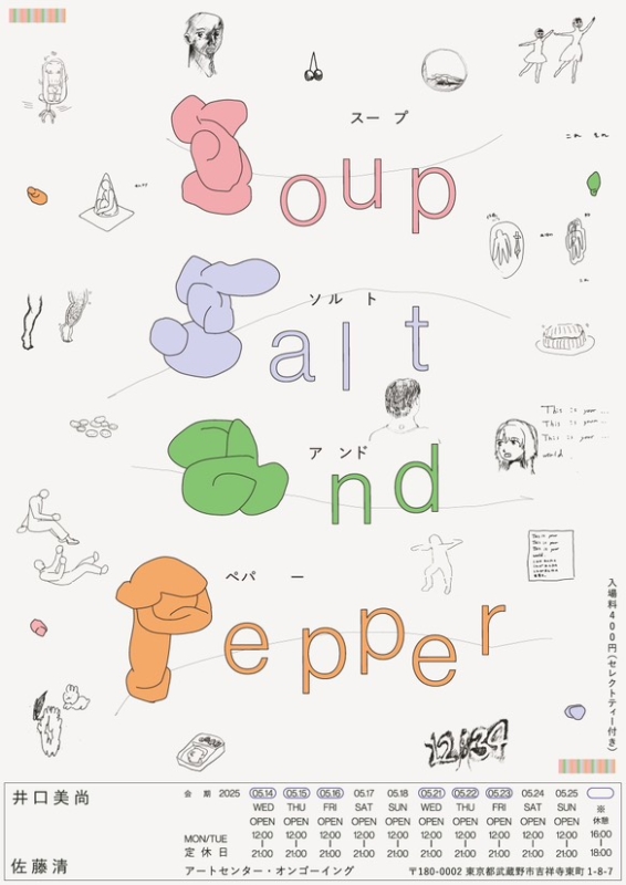 Soup Salt and Pepper 開催日 2025年5月14日(水)〜25日(日) 時間 12:00〜21:00(月火定休、水木金は16:00〜18:00休憩) 会場 Art Center Ongoing〒180-0002 武蔵野市吉祥寺東町1-8-7 Web https://www.ongoing.jp/tag/video/soup/