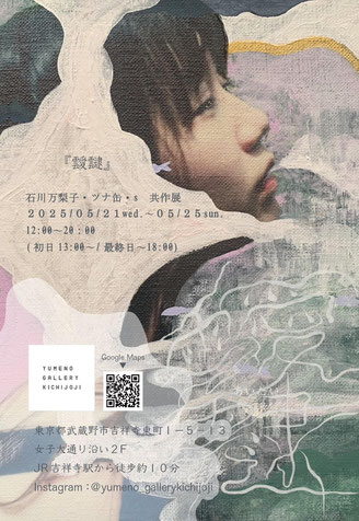 石川万梨子・ツナ缶・s 共作展「靉靆」 開催日 2025年5月21日(水)〜25日(日) 時間 12:00 〜20:00(初日13:00から、最終日18:00まで) 会場 ユメノギャラリー吉祥寺〒180-0002 東京都武蔵野市吉祥寺東町1-5-13 はぴすと押山2F Web https://www.yumenogallerykichijoji.com/schedule/