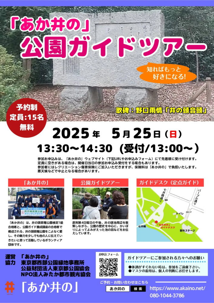 [運営]井の頭恩賜公園ボランティアガイド「あか井の」 [協力]東京都西部公園緑地事務所/(公財)東京都公園協会/NPO法人みたか都市観光協会