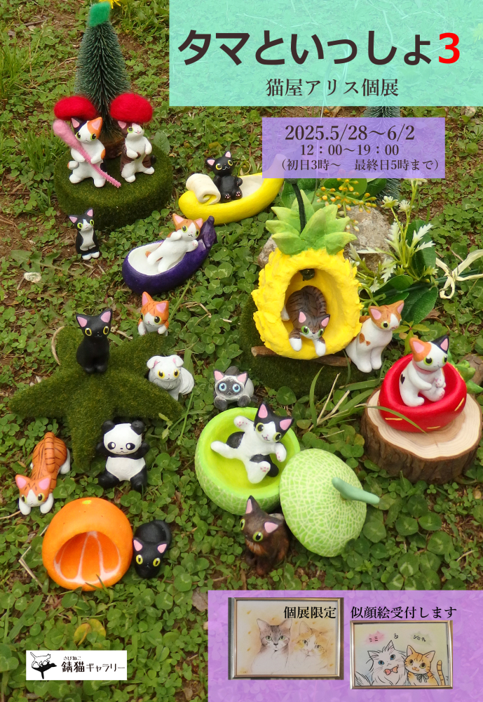 猫屋アリス個展「タマといっしょ3」 開催日 2025年5月28日(水)~6月2日(月) 時間 12:00~19:00(初日15:00から、最終日17:00まで) 会場 錆猫ギャラリー〒180-0004 東京都武蔵野市吉祥寺本町2-33-1 Web https://sabineko-gallery.com/?p=22971