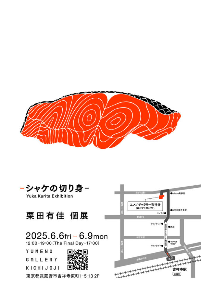 栗田有佳 個展 「ーシャケの切り身ー」 開催日 2025年6月6日(金)〜9日(月) 時間 12:00〜19:00(最終日17:00まで) 会場 ユメノギャラリー吉祥寺〒180-0002 東京都武蔵野市吉祥寺東町1-5-13 はぴすと押山2F Web https://www.yumenogallerykichijoji.com/schedule/