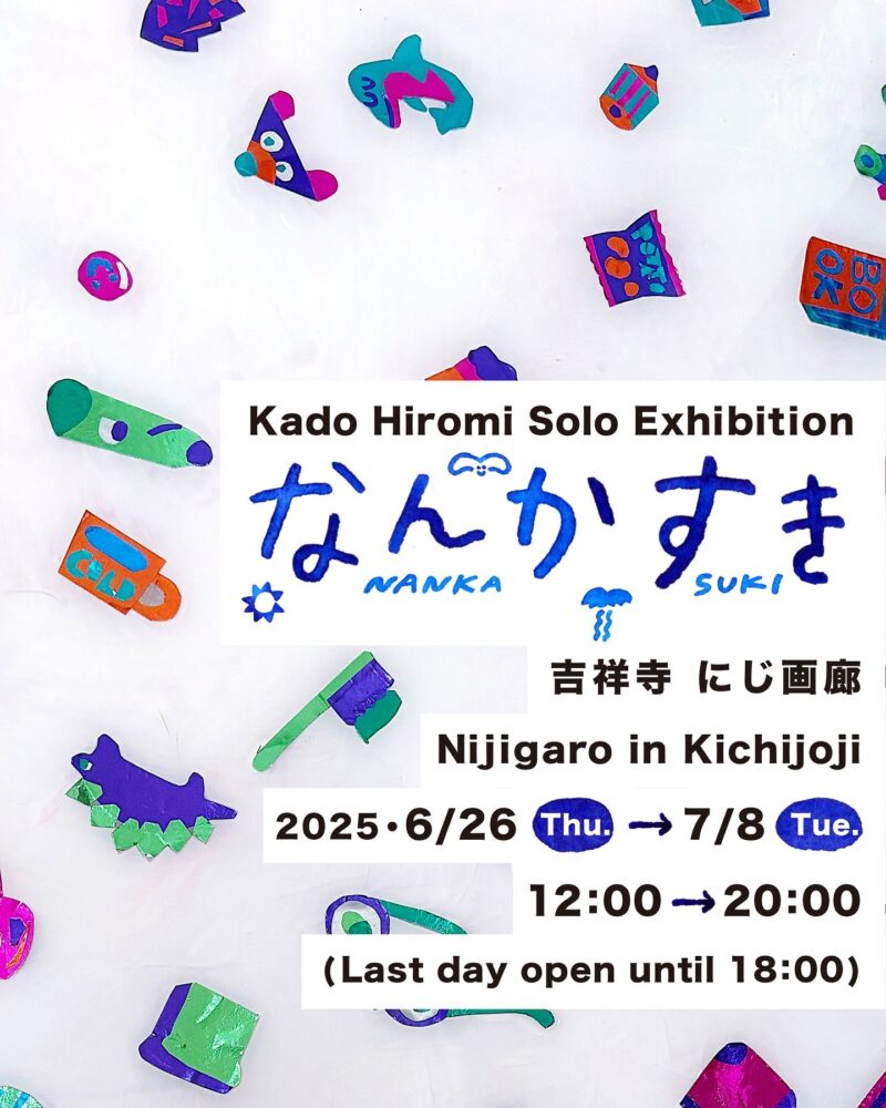 Kado Hiromi Solo Exhibition なんかすき 開催日 2025年6月26日(木)~7月8日(火) ※水曜定休 時間 12:00~20:00(最終日18:00まで) 会場 にじ画廊〒180‐0004 東京都武蔵野市吉祥寺本町2‐2‐10 JR中央線 吉祥寺駅より徒歩4分 Web http://nijigaro.com/exhibition.htm