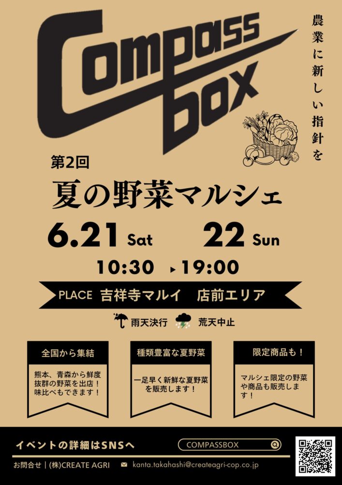 第2回夏の野菜マルシェ 開催日 2025年6月21日(土)22日(日) 時間 10:30〜19:00 会場 吉祥寺マルイ〒180-0003 東京都武蔵野市吉祥寺南町1-7-1 Instagram @compass_box_jp