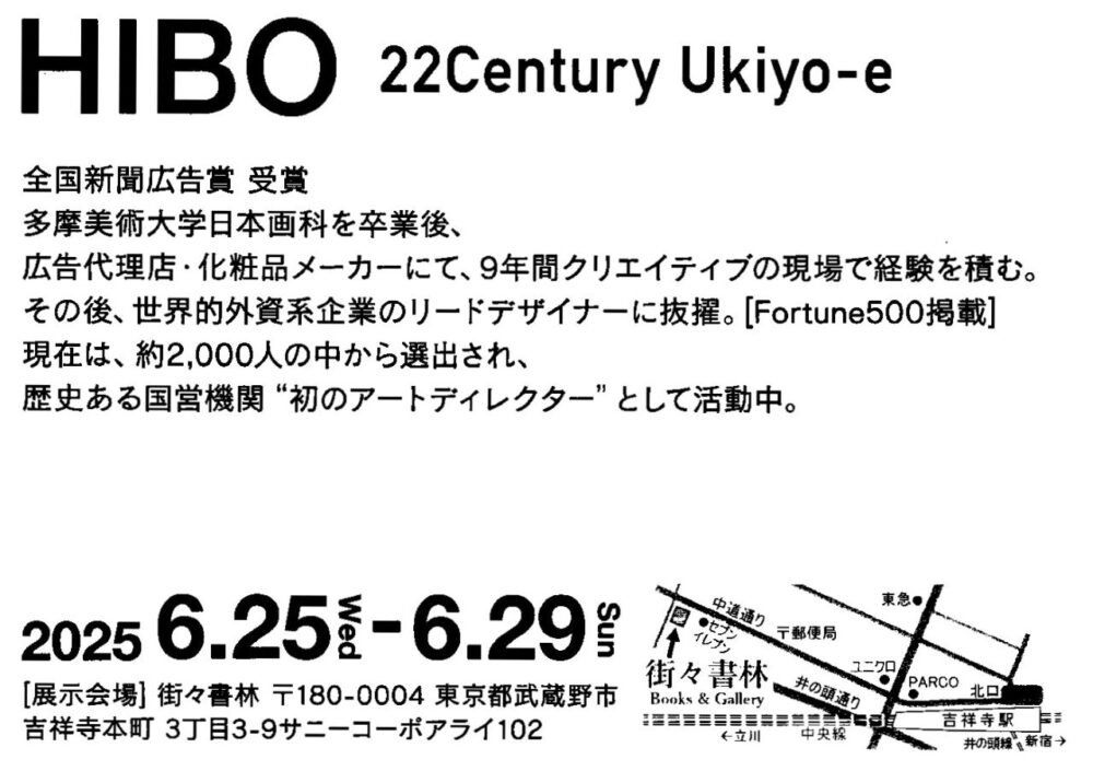 22世紀の浮世絵 HIBO展 開催日 2025年6月25日(水)~29日(日) 時間 12:34~18:00 会場 街々書林 Books & Gallery〒180-0004 東京都武蔵野市吉祥寺本町3-3−9 Web https://machi2.hp.peraichi.com/tabi/ Instagram @art_hibo