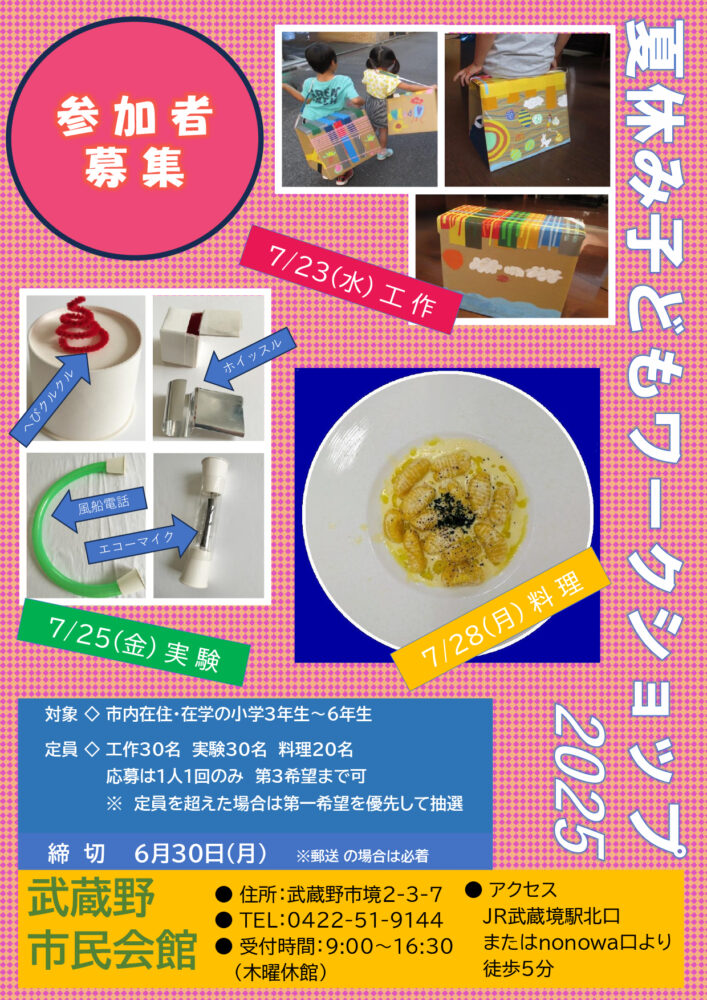 (1)(2)1,000円(材料費)/(3)1,200円(材料費) 対象:武蔵野市内在住・在学の小学3年生~6年生 定員:(1)(2)30名/(3)20名 会場:集会室・料理室