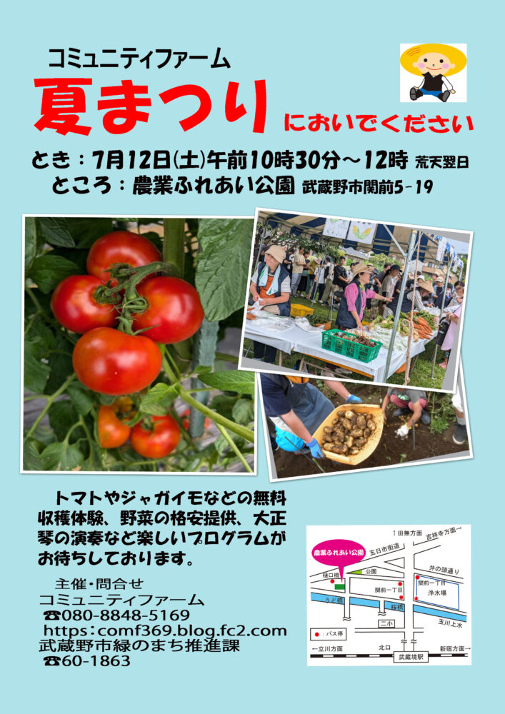 農業ふれあい公園「夏まつり」 開催日 2025年7月12日(土)※荒天の場合は翌日7月13日(日)に実施 時間 10:30〜12:00 料金など 事前申し込み不要 お問い合わせ 080-8848-5169 コミュニティファーム 会場 農業ふれあい公園〒180-0014 東京都武蔵野市関前5-19 Web https://www.city.musashino.lg.jp/gomi_kankyo/midori_koen/event_midorinomachisuishin/1044278.html