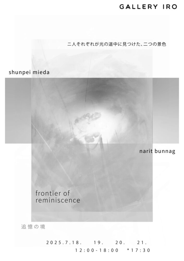 追憶の境 frontier of reminiscence 開催日 2025年7月18日(金)〜21日(月・祝) 時間 12:00〜18:00(最終日17:30まで) 会場 GALLERY IRO〒180-0004 東京都武蔵野市吉祥寺本町1-37-7-101 吉祥寺駅より西荻窪方面へ歩いて7分程度、五日市街道沿い。 Web https://1-6.jp/frontier-of-reminiscence