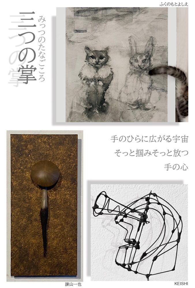 三つの掌 諫山一也・KEISHI・ふくのもとよしえ・三人展 開催日 2025年7月18日(金)〜8月2日(土)※7/22(火)、28(月)、29(火)休み 時間 14:00〜19:00 会場 gallery shell102〒180-0003 東京都武蔵野市吉祥寺南町2-29-10 エクセル井の頭102JR吉祥寺駅から末広通りをまっすぐ歩いて8〜10分 Web https://shell102.com/tanagokoro/