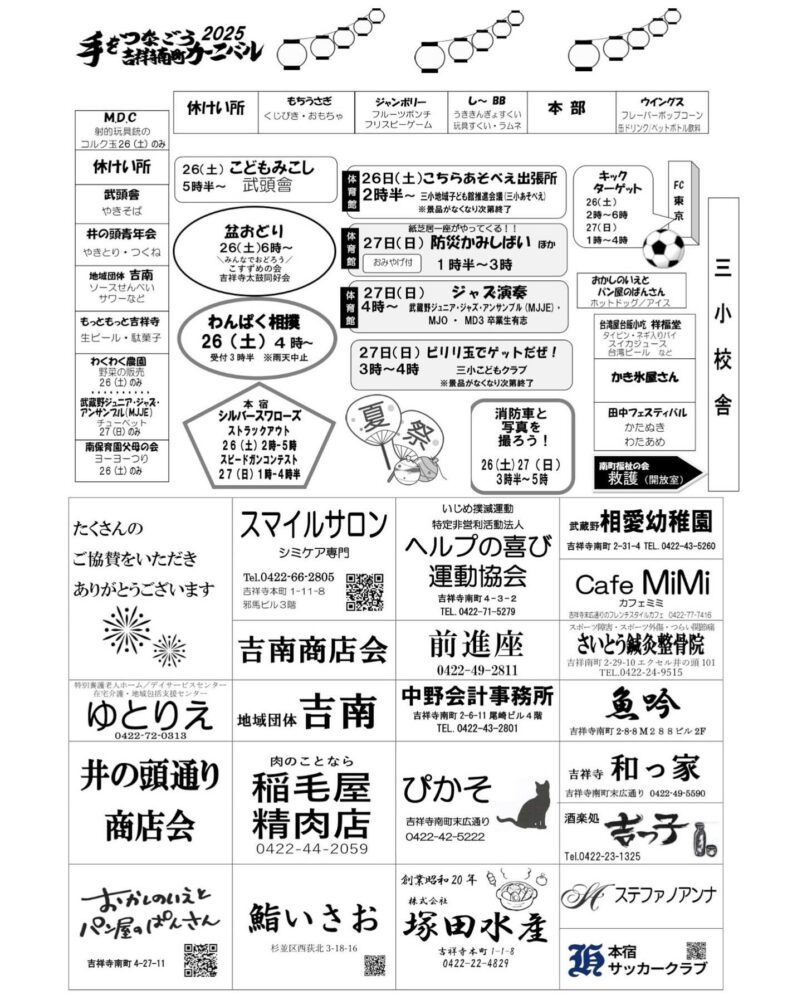 [主催]手をつなごう吉祥寺南町カーニバル2025実行委員会 [共催]青少協第三地区委員会 [協賛]南町コミュニティ協議会 [会場協力]武蔵野市立第三小学校/武蔵野市立第三中学校/武蔵野市立第三小学校PTA/武蔵野市立第三中学校PTA