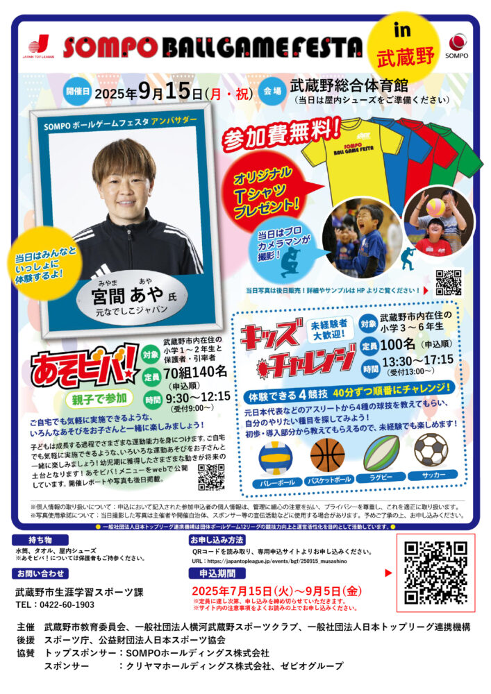 無料 〈あそビバ!〉 対象:武蔵野市内在住の小学1~2年生と保護者1名 定員:70組140名(申込制・先着順) 〈キッズチャレンジ〉 対象:武蔵野市内在住の小学3~6年生 定員:100名(申込制・先着順) 持ち物:水筒、タオル、屋内シューズ(あそビバ!に参加される保護者も) 会場:メインアリーナ
