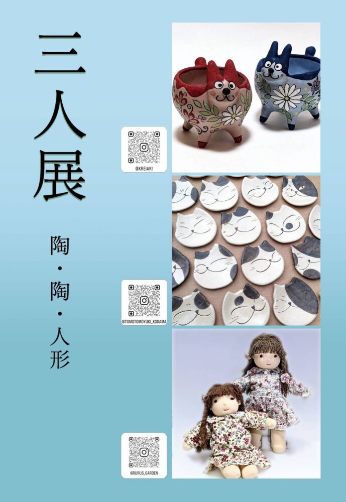 三人展~陶・陶・人形~ 開催日 2025年7月30日(水)~8月4日(月) 時間 12:00~19:00(初日14:00より、最終日17:00まで) 会場 錆猫ギャラリー〒180-0004 東京都武蔵野市吉祥寺本町2-33-1 Web https://sabineko-gallery.com/?p=23173