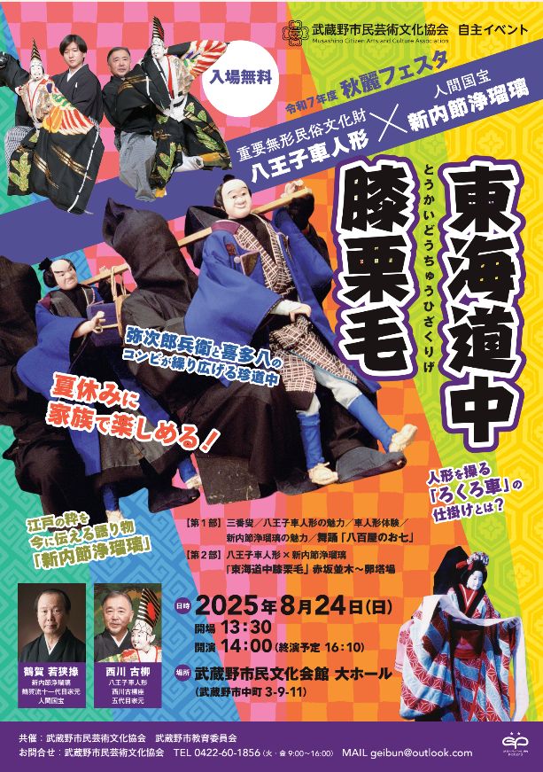 第1部 ● 三番叟 ● 八王子車人形の魅力 ● 車人形体験 ● 新内節浄瑠璃の魅力 ● 舞踊「八百屋のお七」 新内節浄瑠璃:鶴賀 伊勢吉 三味線:鶴賀 鶴二郎 上調子:鶴賀 伊勢一郎 第2部 ● 「東海道中膝栗毛」 赤坂並木~卵塔場 車人形:西川古柳座 新内節浄瑠璃:鶴賀 若狭掾(人間国宝) 三味線:鶴賀 伊勢吉 上調子:鶴賀 伊勢一郎