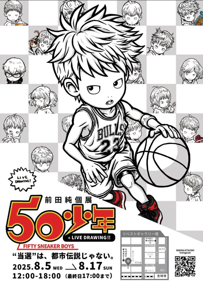 前田純 個展 50少年 “当選”は、都市伝説じゃない。 開催日 2025年8月5日(火)〜17日(日) 時間 12:00~18:00(最終日17:00まで) 会場 リベストギャラリー優〒180-0004 東京都武蔵野市吉祥寺本町2-26-10-1F Web https://libestgallery.jp/2025-08-05/