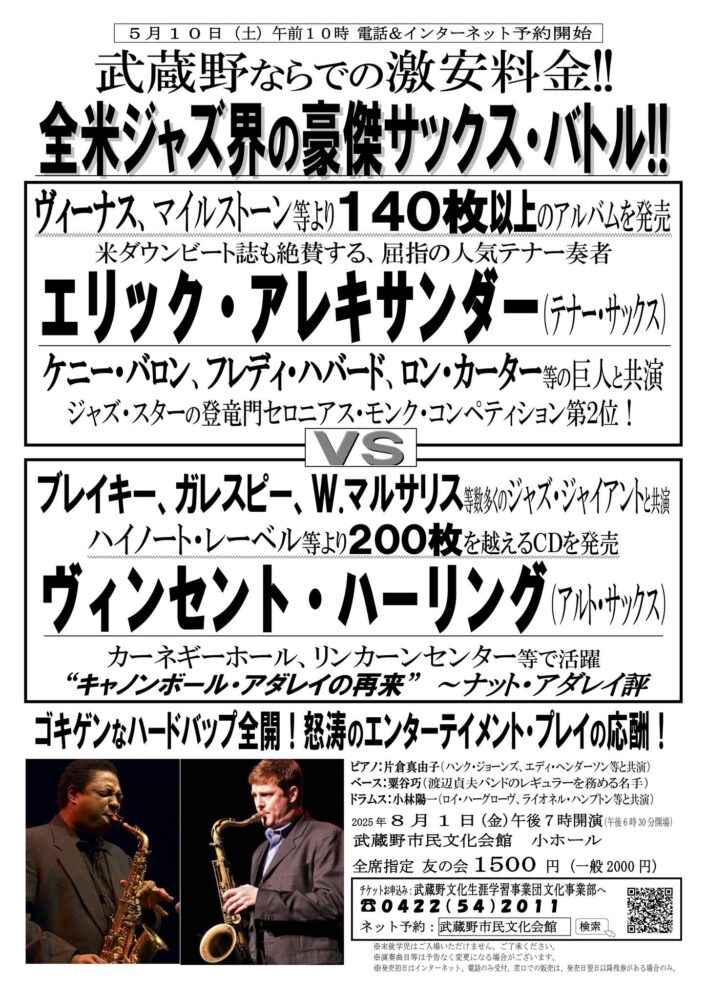エリック・アレキサンダー(テナー・サックス) ヴィンセント・ハーリング(アルト・サックス) 片倉真由子(ピアノ) 粟谷巧(ベース) 小林陽一(ドラムス)
