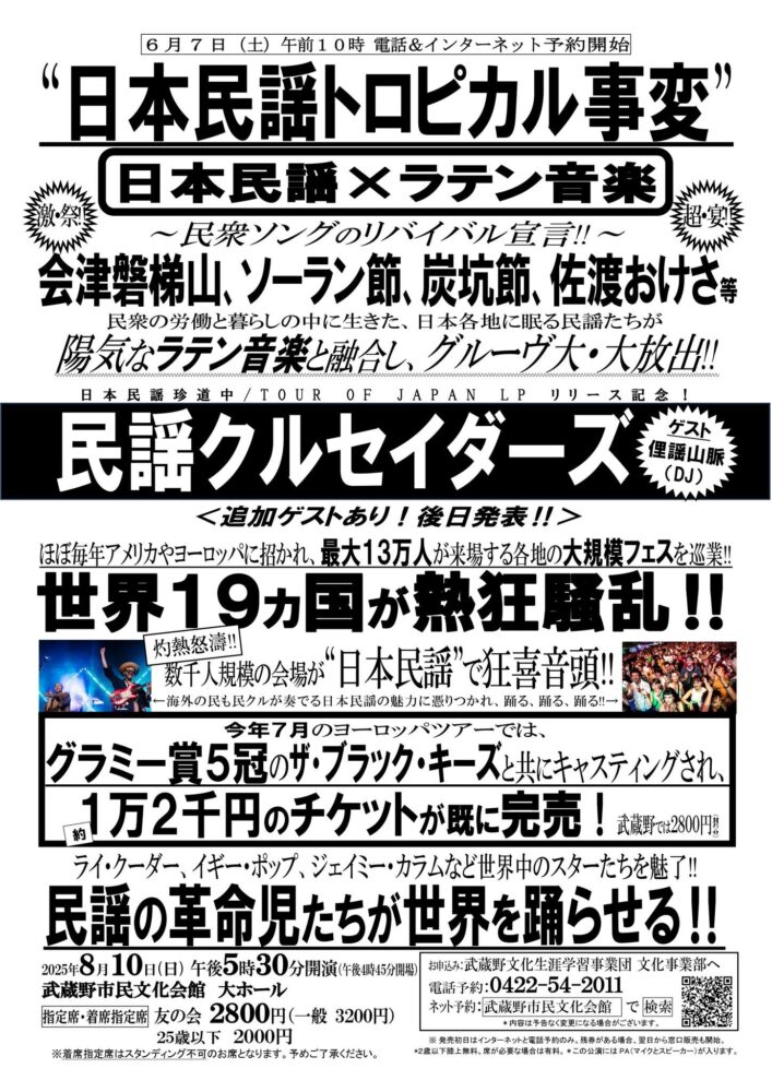 民謡クルセイダーズ ゲスト:俚謡山脈(DJ) 追加ゲスト:一青窈 追加ゲスト:エレクトロニコス・ファンタスティコス!(前座) VJ:VIDEOTAPEMUSIC