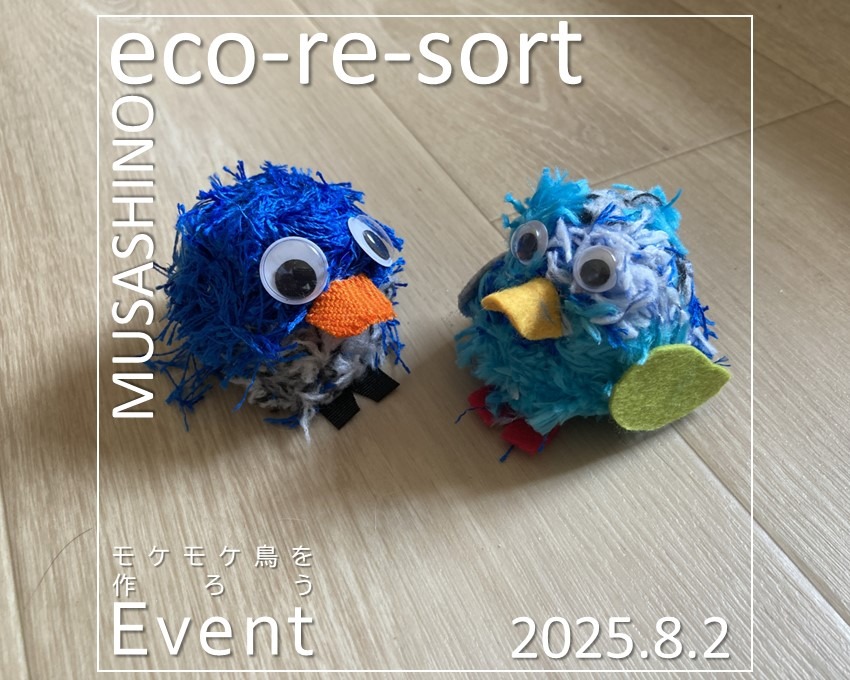 モケモケ鳥を作ろう 開催日 2025年8月2日(土) 時間 10:00~10:30 料金など 無料 対象:武蔵野市内在住・在学の小学生以下 ※小学3年生以下は保護者同伴 定員:10組(申込み終了) 会場 むさしのエコreゾート〒180-0012 武蔵野市緑町3丁目1番5号 出演 講師:はっぴーサロン Web https://musashino-ecoresort.com/eventinfo/eventnews/ecoresort-workshoop-202508_02/ Instagram @musashino_eco_resort