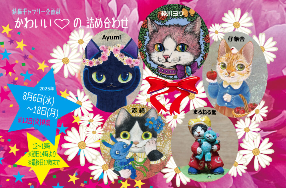 錆猫ギャラリー企画展「かわいい♡の詰め合わせ」 開催日 2025年8月6日(水)〜18日(月)※12日(火)休業 時間 12:00~19:00(初日14:00から、最終日17:00まで) 会場 錆猫ギャラリー〒180-0004 東京都武蔵野市吉祥寺本町2-33-1 Web https://sabineko-gallery.com/?p=23084
