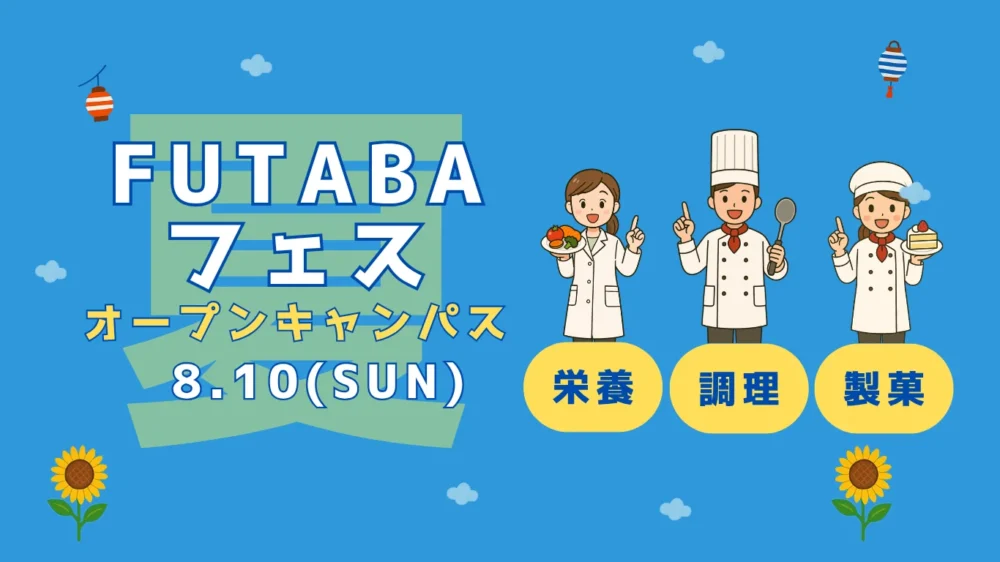FUTABA夏フェス 「栄養」「調理」「製菓」全ての学科の実習を体験できます! 実習以外でも、先生が運営するカフェや、コンクールで受賞歴のある先生による技術披露など、イベント盛りだくさん。 開催日 2025年8月10日(日) 会場 学校法人二葉総合学園〒180-0003 東京都武蔵野市吉祥寺南町1-3-2 Web https://futaba-sogo.ac.jp/futaba_summer_fes2025/