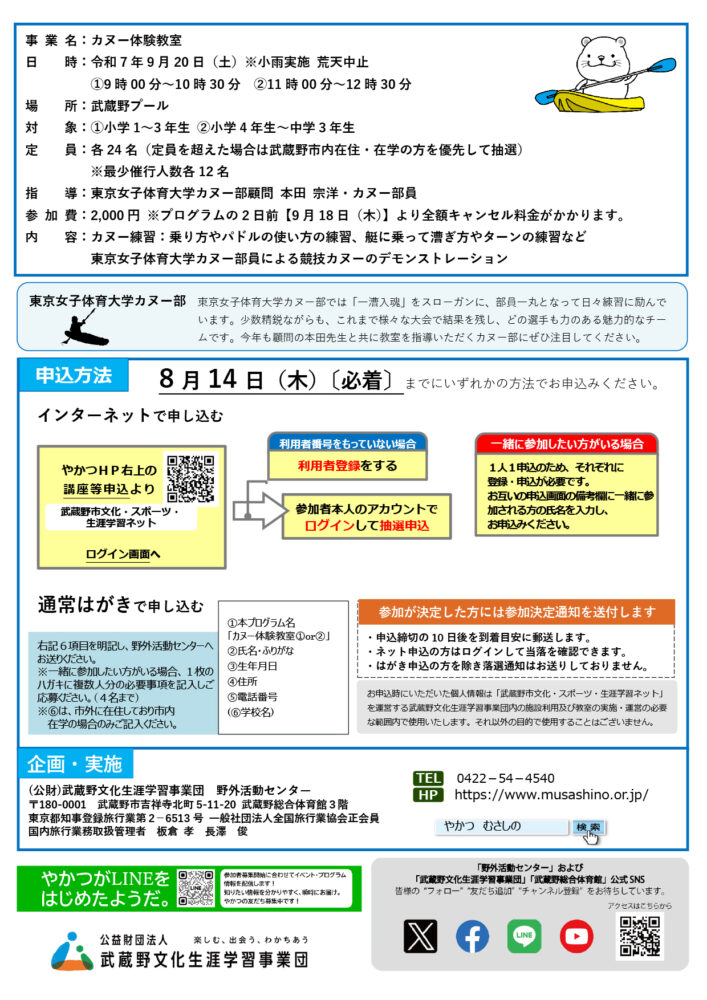 0422-54-4540 (公財)武蔵野文化生涯学習事業団 野外活動センター 東京都知事登録旅行業第2-6513号 一般社団法人全国旅行業協会正会員