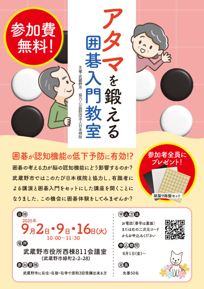 9月2日(火)、9日(火)講演会10:00〜10:30/囲碁入門教室10:30〜11:30 9月16日(火)囲碁入門教室10:00〜11:30