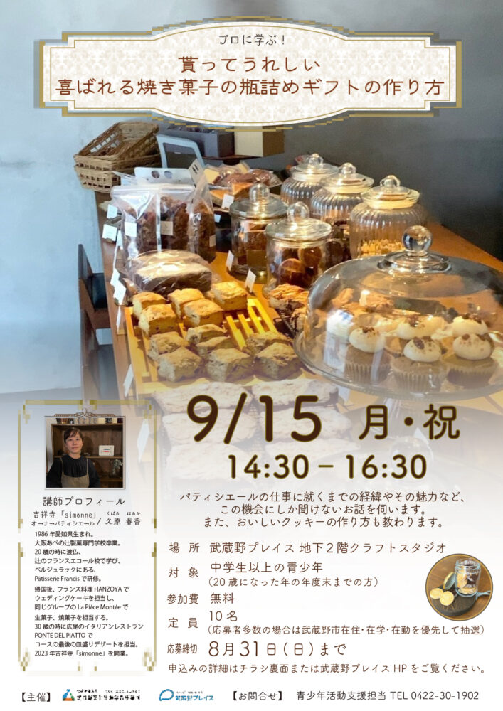 無料 対象:中学生以上の青少年(20歳になった年の年度末までの方) 定員:10名(申込制・抽選) 持ち物:エプロン、三角巾、ふた付きの飲み物、清潔なハンドタオル 会場:地下2階クラフトスタジオ