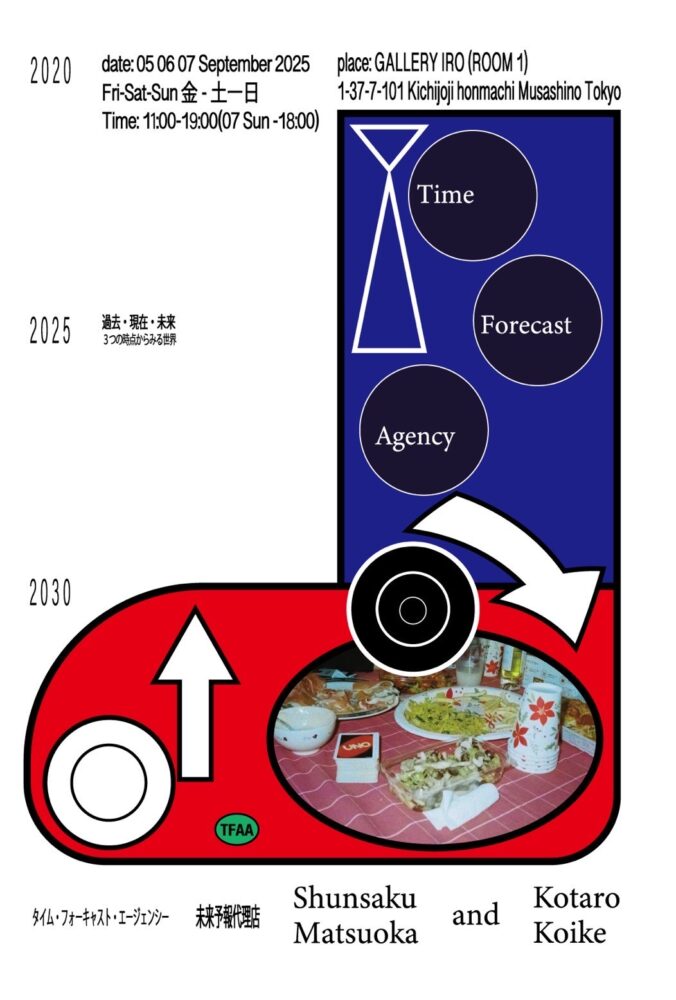 Time Forecast Agency 開催日 2025年9月5日(金)〜7日(日) 時間 12:00〜19:00(最終日18:00まで) 会場 GALLERY IRO〒180-0004 東京都武蔵野市吉祥寺本町1-37-7-101 吉祥寺駅より西荻窪方面へ歩いて7分程度、五日市街道沿い。 Web https://1-6.jp/tfa