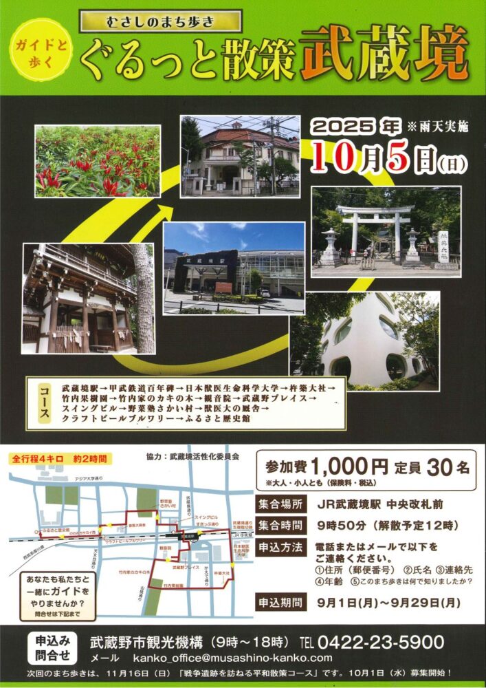 ガイドコース ◆全行程4キロ、約2時間 武蔵境駅 ~ 甲武鉄道百年碑 ~ 日本獣医生命科学大学 ~ 杵築大社 ~ 竹内果樹園 ~ 竹内家のカキの木 ~ 観音院 ~ 武蔵野プレイス ~ スイングビル ~ 野菜塾さかい村 ~ 亜細亜大前 ~ ふるさと歴史館