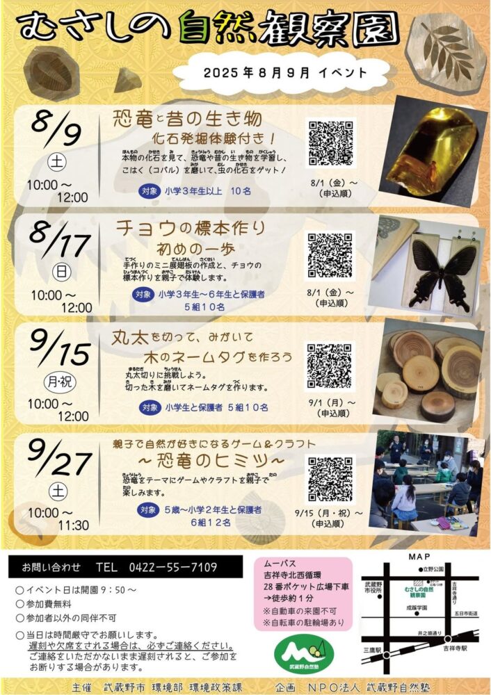むさしの自然観察園「丸太を切って、みがいて、木のネームタグを作ろう」 開催日 2025年9月15日(月・祝) 時間 10:00〜12:00 料金など 無料 対象:小学生と保護者 定員:5組10名(申込制・先着順) 会場 むさしの自然観察園〒180-0001 東京都武蔵野市吉祥寺北町3-12 ムーバス 吉祥寺北西循環 28ポケット広場下車、徒歩1分 主催 [主催]武蔵野市 Web https://www.city.musashino.lg.jp/kids/event/1051638.html Facebook www.facebook.com/profile.php?id=100064797993710
