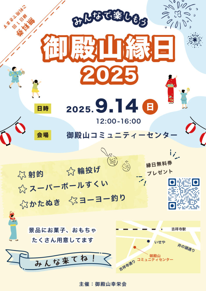 御殿山縁日 2025 開催日 2025年9月14日(日) 時間 12:00 ~ 16:00 会場 御殿山コミュニティセンター〒180-0005 武蔵野市御殿山1-5-11 吉祥寺駅徒歩3分 主催 [主催]御殿山幸栄会 Web https://gotenyama.info/