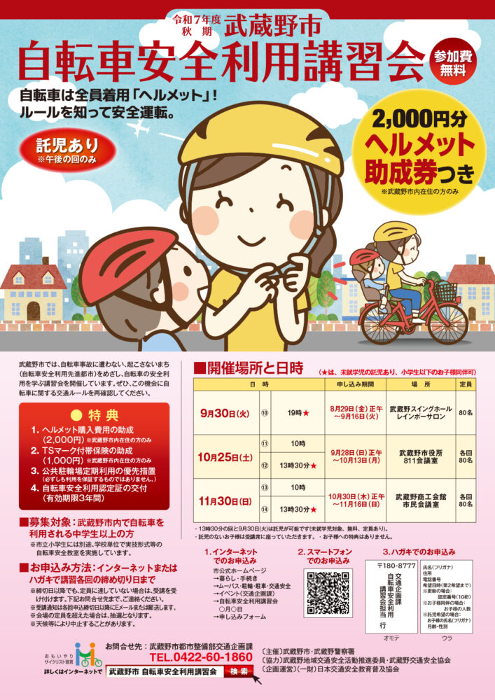 無料 対象:武蔵野市内で自転車を利用される中学生以上の方 定員:80名(申込制・抽選)