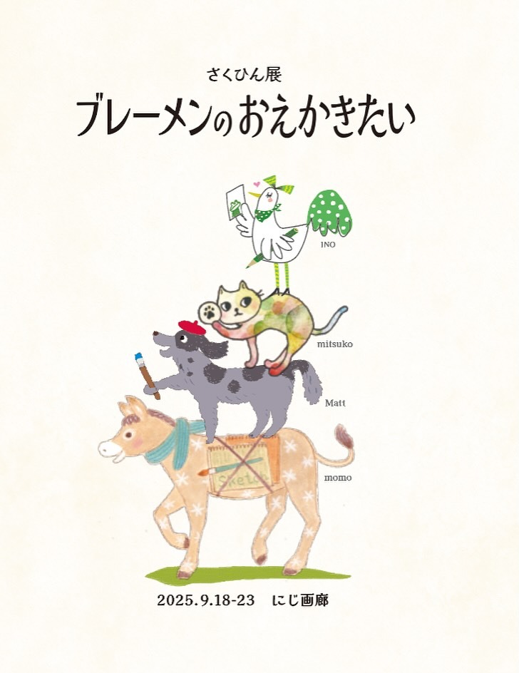 まるやまものつくり舎 さくひん展「ブレーメンのおえかきたい」 開催日 2025年9月18日(木)~23日(火) 時間 12:00~20:00(最終日17:00まで) 会場 にじ画廊〒180‐0004 東京都武蔵野市吉祥寺本町2‐2‐10 JR中央線 吉祥寺駅より徒歩4分 Web http://nijigaro.com/exhibition.htm
