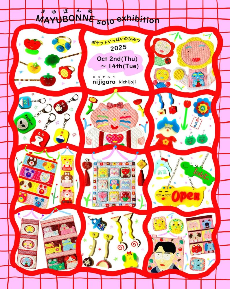 MAYUBONNE solo exhibition ポケットいっぱいのひみつ 開催日 2025年10月2日(木)~14日(火)※水曜定休 時間 12:00~20:00(最終日18:00まで) 会場 にじ画廊〒180‐0004 東京都武蔵野市吉祥寺本町2‐2‐10 JR中央線 吉祥寺駅より徒歩4分 Web http://nijigaro.com/minispace.html Instagram @mayubonne3
